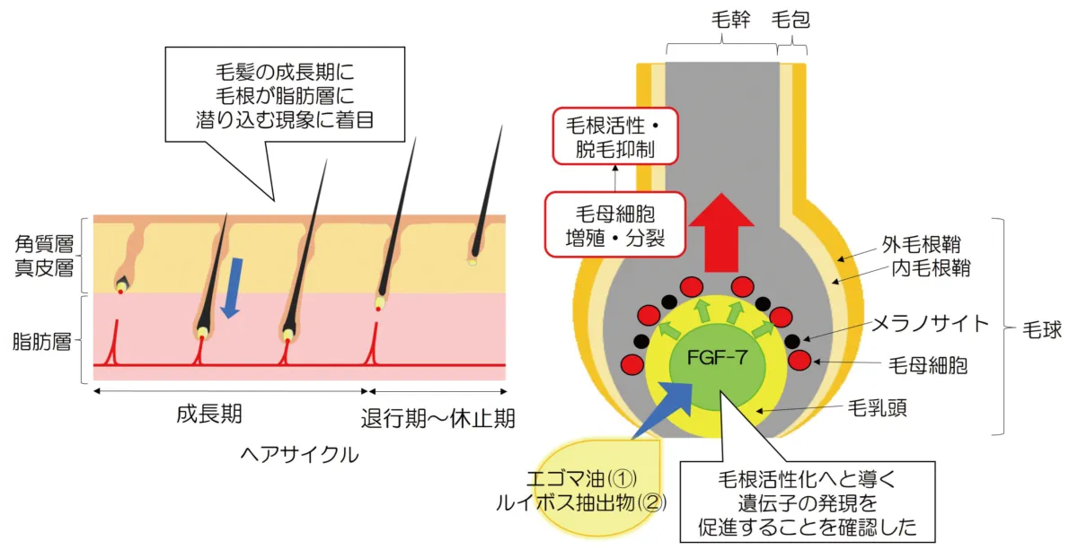 この技術の根幹を成すのは、特定の植物油と植物エキスを組み合わせた新たなアプローチです。具体的には、エゴマ油などの油溶性成分がFGF-7の生成を促進し、更にルイボス抽出物などの水溶性成分が毛髪の成長をサポートします。これにより、毛髪の成長を促すための最適な濃度と配合比が見いだされます。