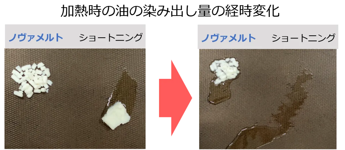 『ノヴァメルト』の最大の特徴は、油脂が加熱時に融け出す過程を管理できる点です。この技術により、食品中に油脂の一部が残り、ジューシーな食感を実現します。また、冷蔵庫での保存時にはしっかりとした硬さを保持し、ミンチ状などの加工も可能です。これにより、視覚的にも食欲をそそるビジュアルが楽しめます。