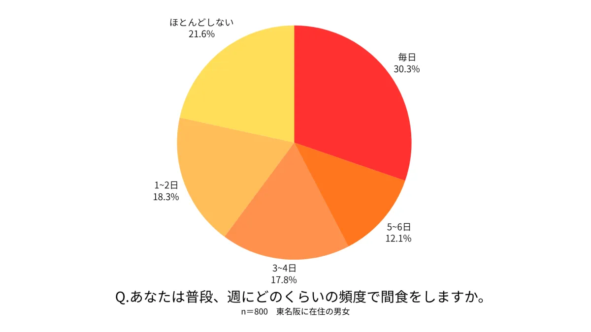 調査によれば、間食をする人は全体の78.5%で、そのうちの30.3%が「毎日」間食をしているとのこと。食べる時間帯は、午後1時から5時59分までが66.4%を占めており、特にランチ後や夕食までの間を埋めるために甘いおやつを求める傾向が強いことがわかります。