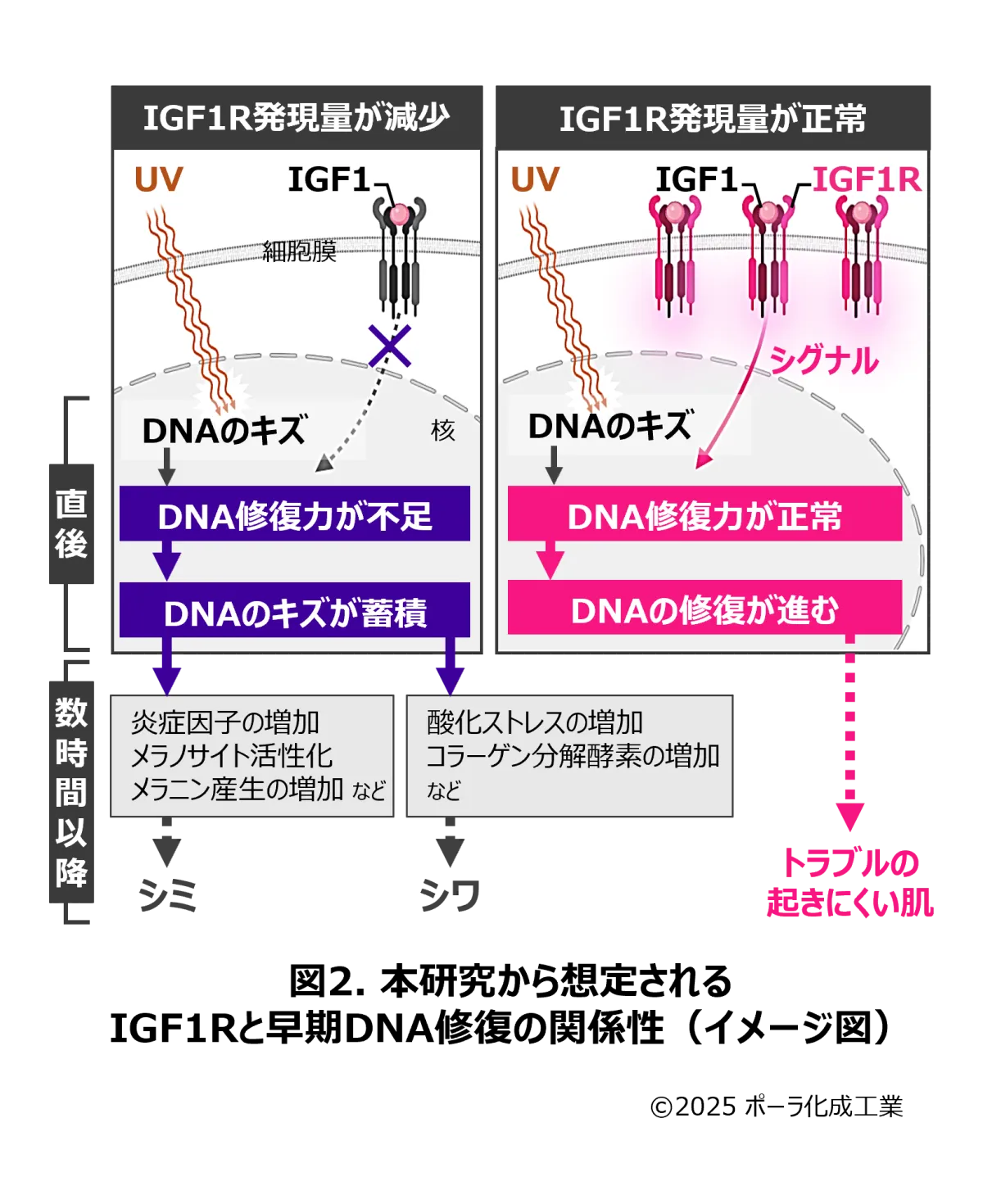 DNAの修復は、細胞が乾燥しきった一般的な条件下でも行われますが、その能力は年齢と共に低下しがちです。加齢や環境要因により、細胞内のIGF1R(Insulin-like Growth Factor 1 Receptor)が減少すると、DNA修復力が低下し、結果としてシミやシワなどの光老化が進行します。研究では、IGF1Rが肌細胞の直後のDNA修復に関与しており、特にUVを受けた直後の修復力に大きく影響を与えることがわかりました。