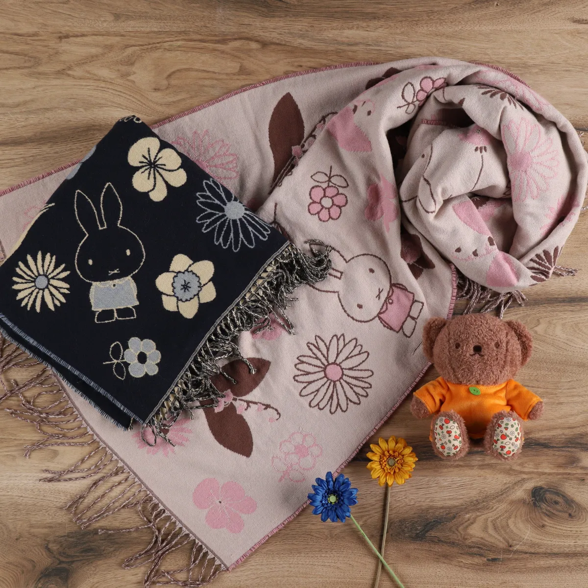 さらに、同日発売となる「Flower Miffy ストール Flower Bloom」は、大人っぽさとカジュアルさを兼ね備えています。ネイビー&アイボリー、ピンク&ブラウンの2色展開で、どちらも普段使いにぴったりです。厚手の生地はこれから訪れる肌寒い季節にも重宝し、アウターとしても、ソファやベッドへのアクセントとしても活躍します。