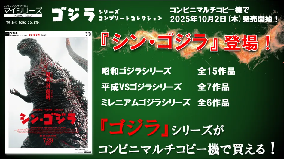 「ゴジラ シリーズ コンプリートコレクション」は、名シーンや美しいポスターデザインをプリントできるサービスです。興味がある方は、まずはコンビニのマルチコピー機をチェックしてみてください。全国約30,000店舗のファミリーマート、ローソン、ミニストップ、ポプラが対象です。