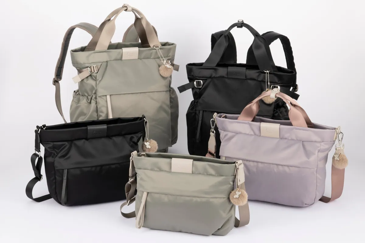 「カナナシュスバッグ2」は、ショルダータイプとリュックタイプがあり、それぞれ小、中、大のサイズが用意されています。カラーは、シックなブラックや柔らかなグレージュ、そして女性らしいモーヴピンクの3色で展開。これにより、好みに合わせて選ぶ楽しさもあります。