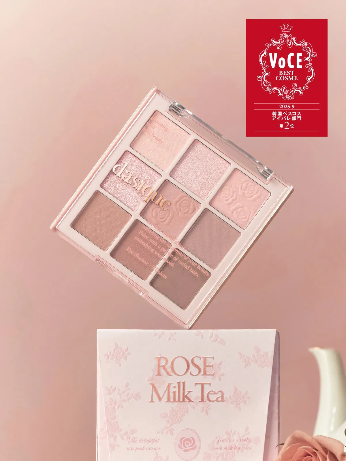 Qoo10アワードのアイパレット部門第3位を獲得したことで、特に人気のアイシャドウパレット「ローズミルクティー」が際立っています。このパレットは、ソフトロージーブラウンのカラーセレクトが特徴で、落ち着いた色合いが魅力です。