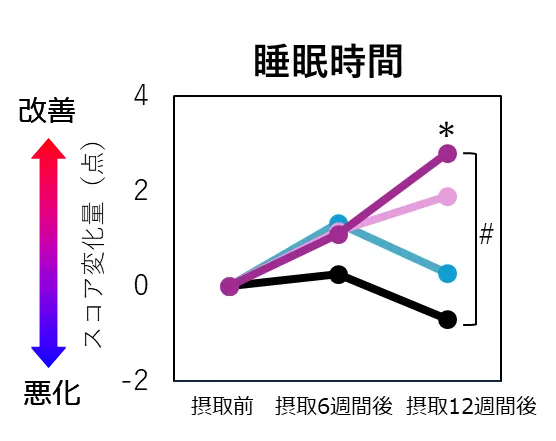 睡眠時間に関する主観的な評価は、併用摂取群がプラセボ群よりも明らかに良好でした。大豆イソフラボンを単独で摂取する場合よりも高い改善効果が得られたことは特筆すべき成果です。