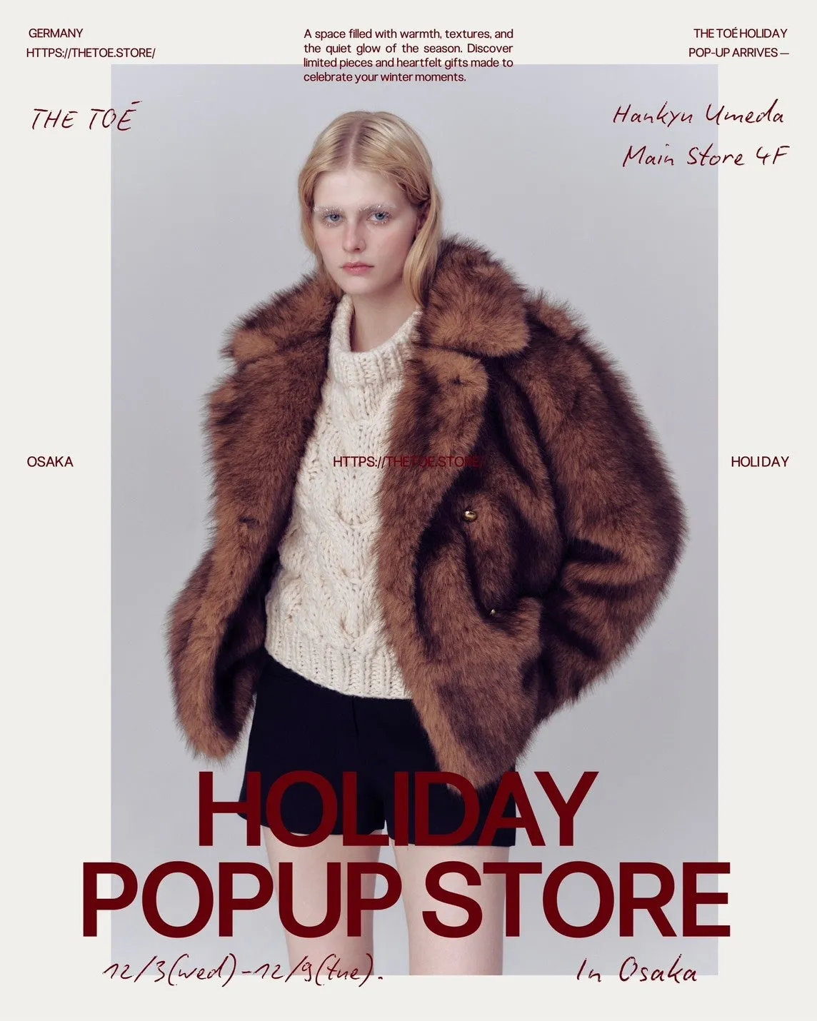 これからの季節、心ときめくファッションアイテムを手に入れるために、ぜひ『THE TOÉ』のPOPUPイベントを訪れてみてはいかがでしょうか。あなたのホリデーシーズンをより特別なものにしてくれるでしょう。