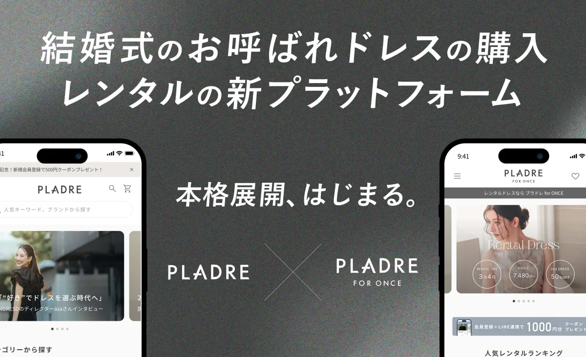 「PLADRE」は、「自分らしいドレス選び」をテーマにしたプラットフォームです。購入だけでなく、レンタルもできる「PLADRE for ONCE」というサービスも展開しており、ドレスに対する選択肢を広げることを目的としています。「特別な日、あなたもあなたらしく輝いてほしい」というコンセプトのもと、厳選されたブランドのドレスが集結しています。