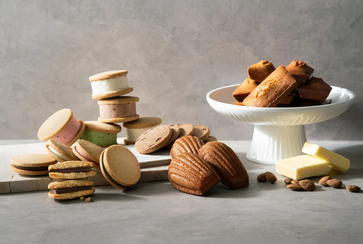 - - サブレ:素焚糖のまろやかな甘みとコクに加え、アーモンドプードルの香ばしさが特徴です。バニーユ、梅いちご、チョコチップ、抹茶、黒ごまの5種類を用意しています。