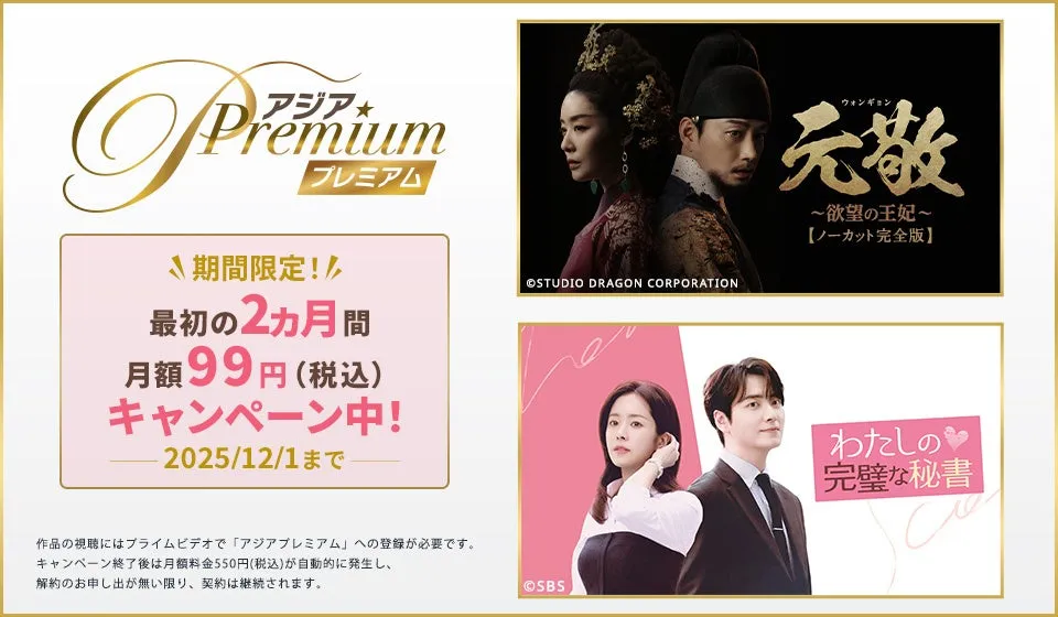 2025年11月14日から2025年12月1日まで、Prime Video内のサブスクリプション『ドラマ&エンタメ☆アジアPremium』にてお得なキャンペーンがスタートします。この期間中、新規または再加入することで、最初の2ヵ月間月額99円(税込)でアジアの魅力的なコンテンツを堪能できます。アジアプレミアムでは、韓国ドラマや中国ドラマなど、500以上の作品が見放題のため、お気に入りのドラマが見つかること間違いなし!