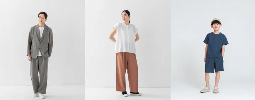 「風を通す」シリーズは、オフィスからカジュアルな日常生活まで幅広く使えるアイテムを揃えています。特に婦人用には、落ち感のあるクリーンな素材感のブラウスやパンツがラインアップ。紳士用ジャケットは、シワ感があり肌に張り付きにくいデザインで、さらさらとした質感を実現しています。これにより、夏の暑さでもスマートな印象を保ちながら快適に過ごすことができます。