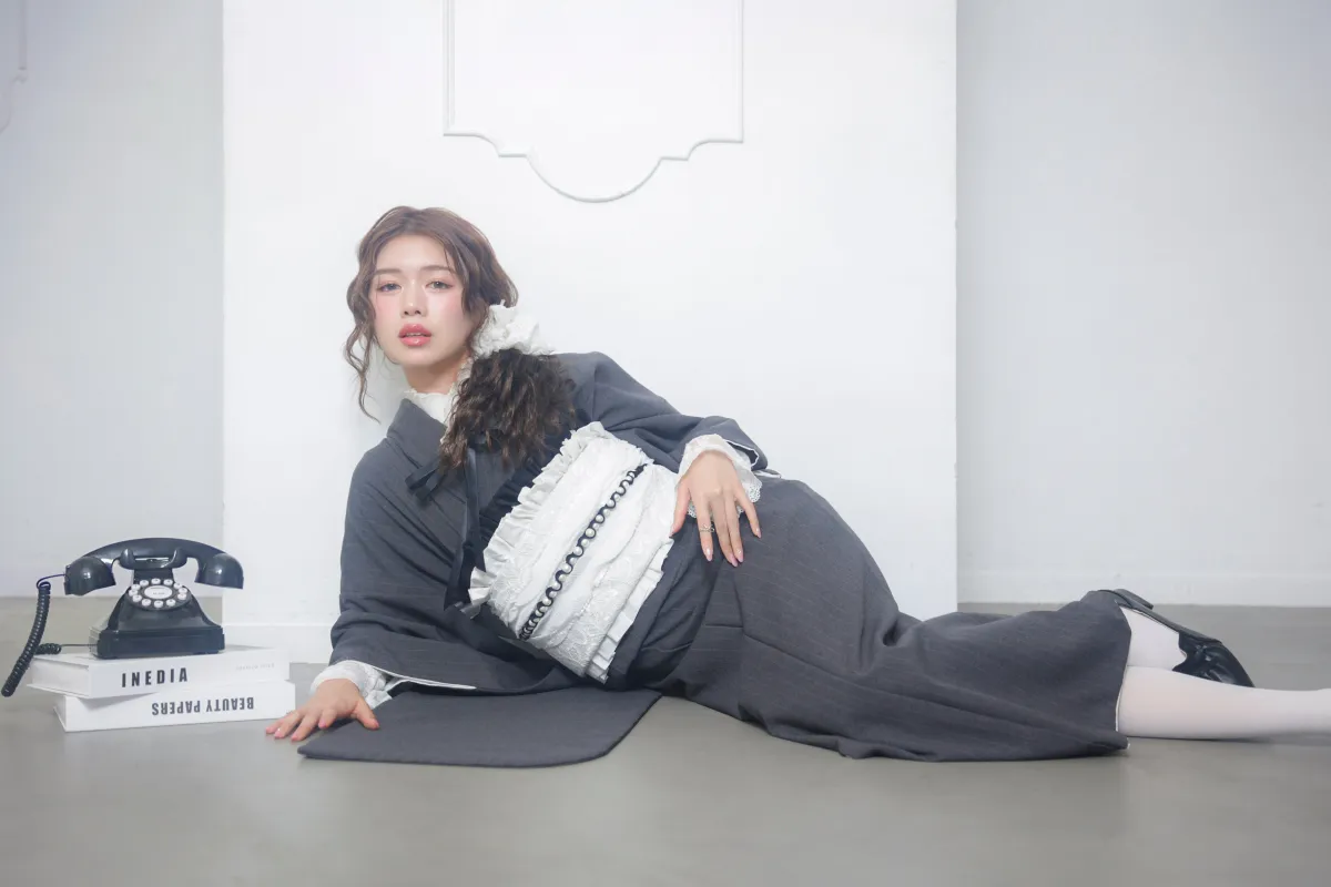 特に注目すべきは、チャコールグレーのスーツスタイルの生地による洗練された印象です。パールの帯締めは、全体に上品な艶を加え、胸元や袖の繊細なレースやフリルが一層の甘さを演出します。また、ウエストに施されたブラックマルチギャザーが、全体を引き締めるアクセントとなり、女性らしさを際立たせるポイントとなっています。