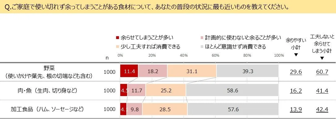 最近、マルタイが実施した調査によると、家庭内で余ってしまう野菜の中で最も多いのは「キャベツ」で、なんと20.1%という数字が出ました。家庭では、週に一回以上食材が余ることに悩んでいるという方が約22%もいることがわかりました。加えて、野菜を使い切るために工夫をしている家庭は60.7%にも上ることが判明しました。