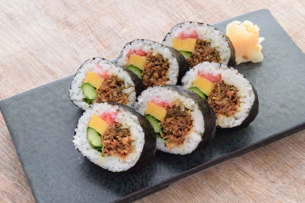 新登場の「太巻 牛しぐれと青森県産ごぼう」は、このいい肉の日に誘われて食べてみたくなる一品です。牛しぐれ煮の甘みと、青森県産ごぼうの旨味が絶妙にフュージョンし、リッチな味わいを約束します。紅生姜のピリッとしたアクセントや、大葉の香りが全体を引き締め、ひと口ごとに新しい発見があります。