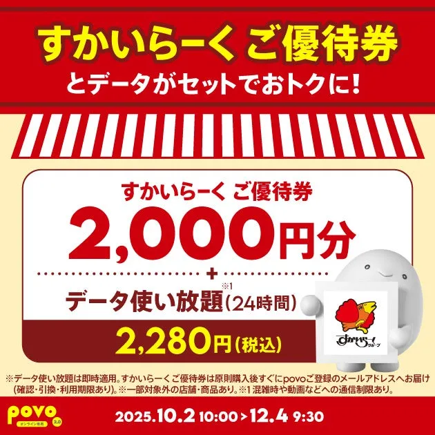 2025年10月2日から、povo2.0で楽しめる新しいトッピングが登場します。KDDIと沖縄セルラーが提供するこのトッピングは、全国のすかいらーくグループの店舗で使える「すかいらーく ご優待券2,000円分」と「データ使い放題(24時間)」のセットで、特別価格の2,280円での販売です。
